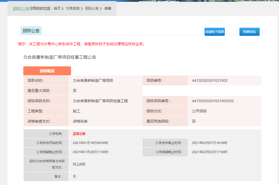 力合良景新制造厂房项目桩基工程 在深圳市公共资源交易中心发布招标公告