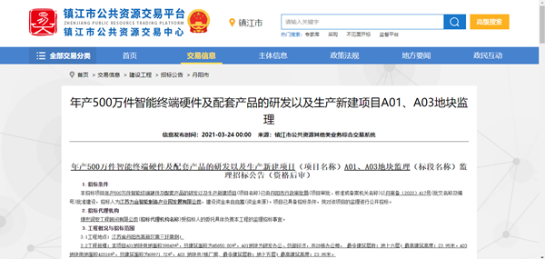 年产500万件智能终端硬件及配套产品的研发以及生产新建项目A01、A03地块监理招标在镇江市公共资源交易中心进行公开招标,有投标意愿者,请于 2021 年3月 24 日起在镇江公共资源交易中心网站http://ggzy.zhenjiang.gov.cn/jyxx/001001/001001002/001001002002/20210324/d5d18f80-29b3-47e8-9641-2596a8d6b3c7.html下载数据电文形式的招标文件。