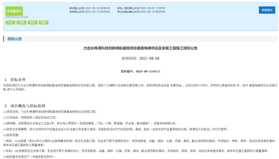 力合长株潭科技创新领航基地项目垂直电梯采购及安装工程在湘潭市公共资源交易中心发布招标公告